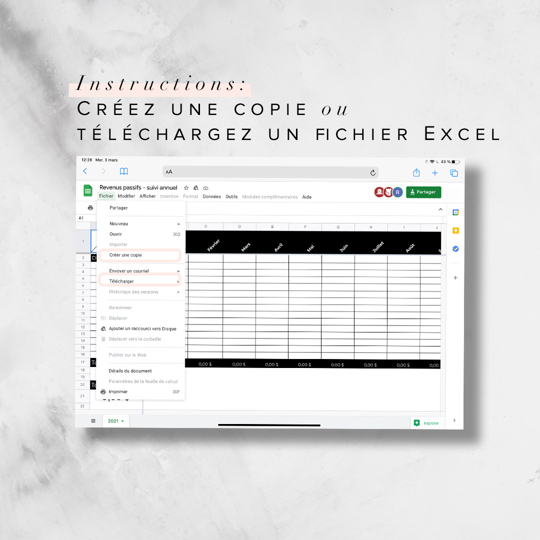 Créez une copie sur votre Google Drive ou encore téléchargez le tableau de suivi en format Excel (XLS).